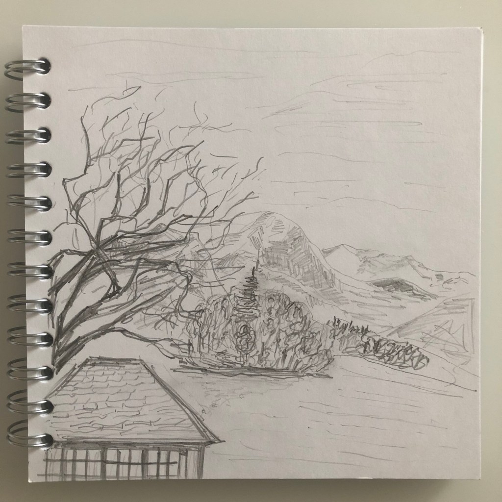 The sketch shows, firstly, the shapes of mountains and the convergence of their slopes on the background; secondly, the reflection of the sky and the island trees in the lake water; finally, the direction of tree branches without leaves indicating a winter season and a tile roof with window frames in the foreground telling us that the drawing was made from the shore, not from the water. Altogether the elements of the sketch convey the atmosphere of Derwentwater near the boat station and express my curiosity and confusion, while I was waiting for the boat cruise.